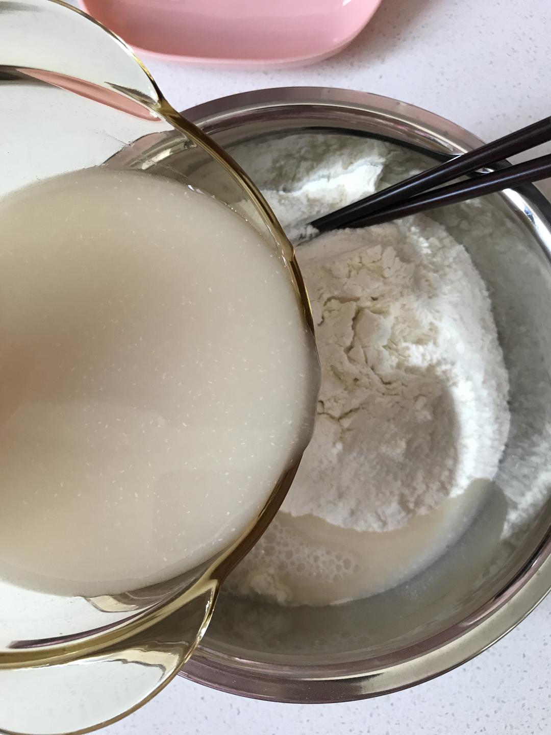 把调好的酵母水倒入面粉中。