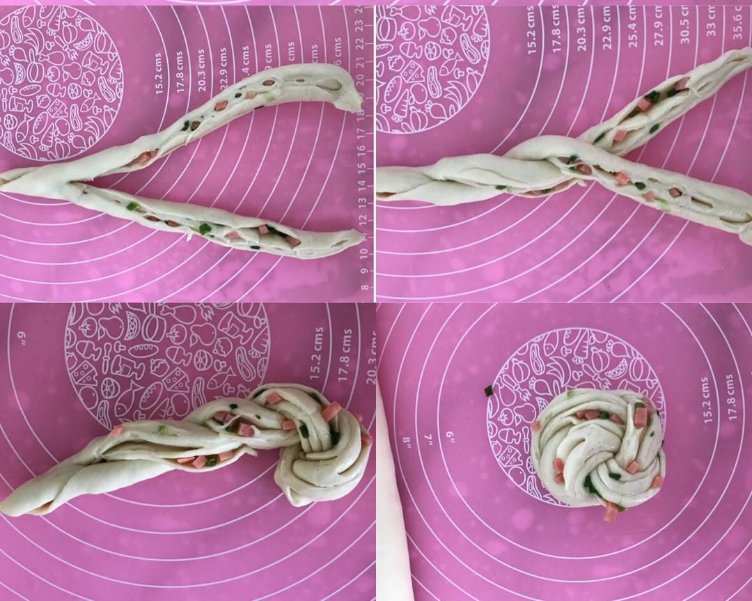 当中切开,像编辫子一样,开口向上,最后卷起来。