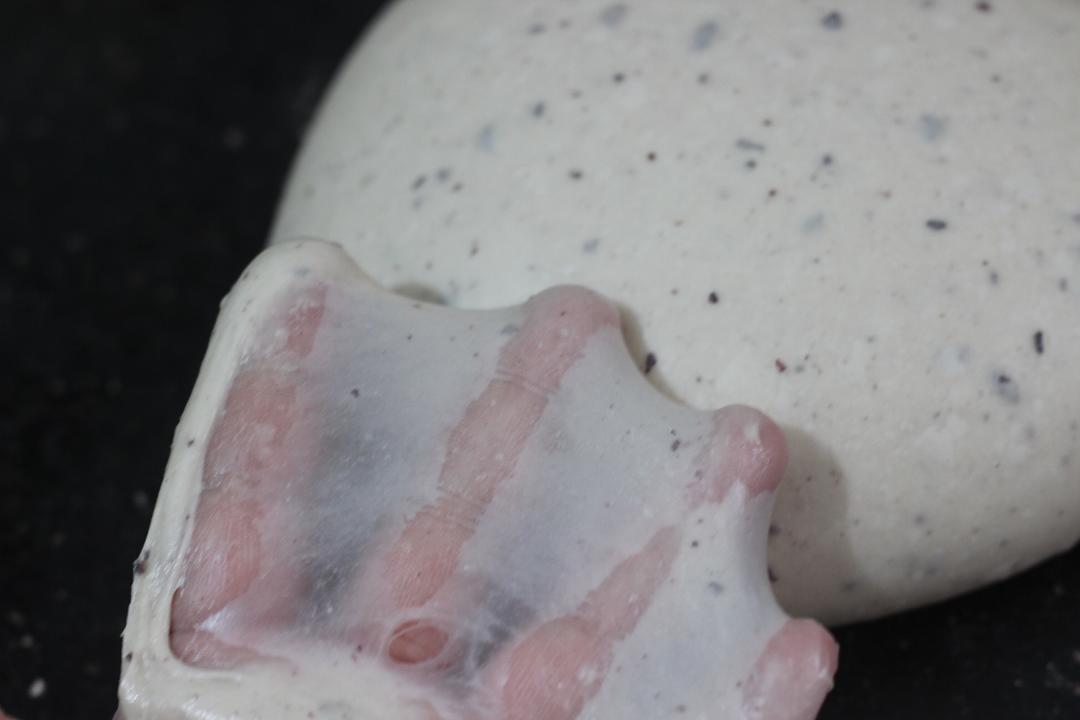 将主面团出黄油和盐以外的材料和酵头一起放入厨师机的搅拌缸,先低速搅拌混合均匀后高速搅打,直至面团能撑出较厚的膜,加入室温软化的黄油和盐,继续搅打直至面团变得柔软不粘缸并且能撑出透明的薄膜。