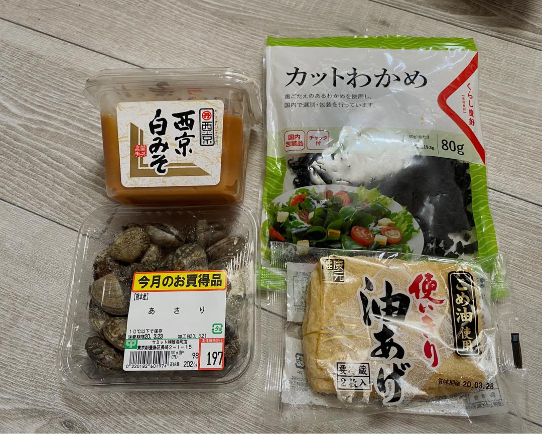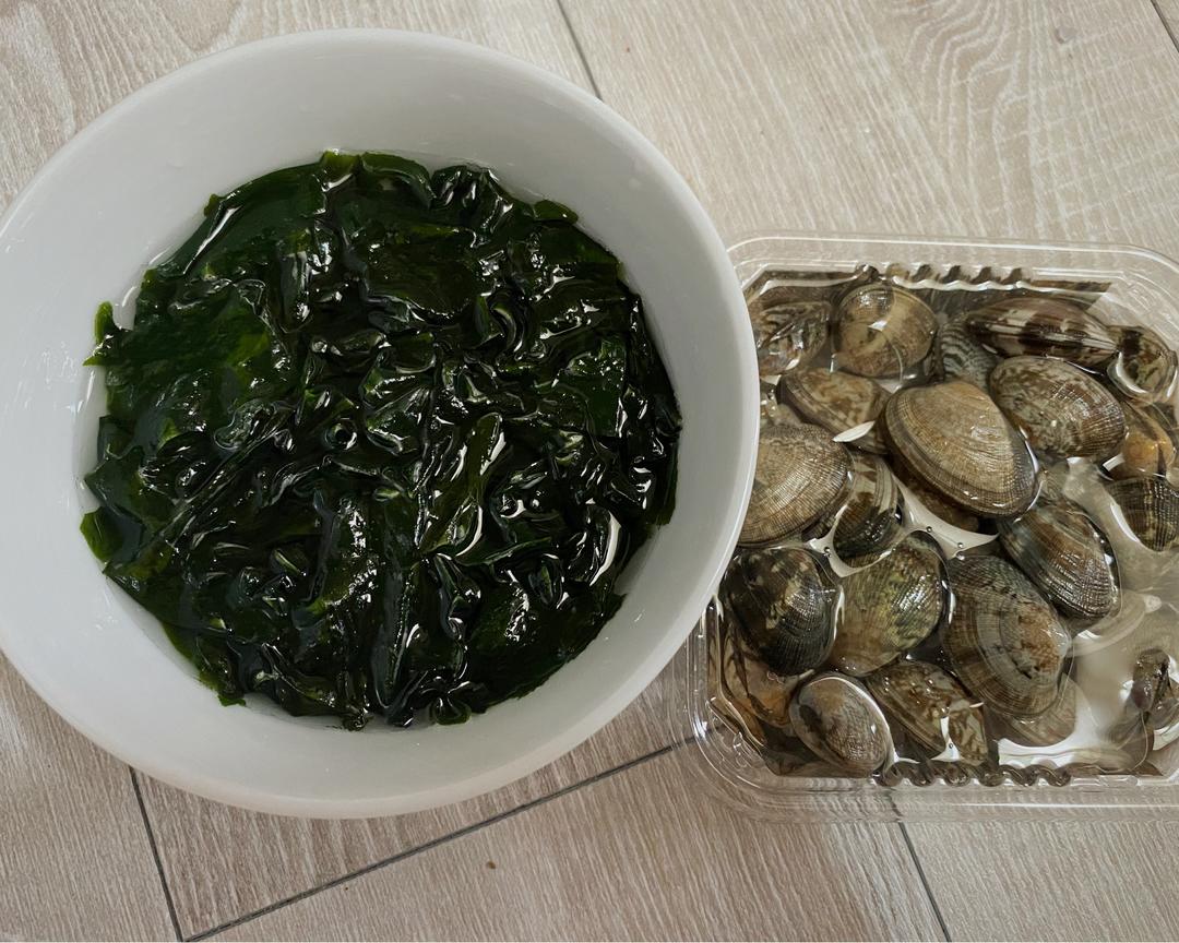 干裙带菜温水泡发、其实我在日本超市买的蛤蜊是已经去沙的,可以直接做,要是没有去过沙的,水里加少许盐先咸死他们,然后放油腻死他们,他们就会忍不住把嘴里珍贵的沙子吐出来了