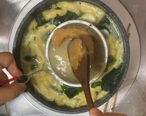 这一步就很关键了,把白味增盛到漏勺里(我就在百元店买的天妇罗的漏勺😂)像视频一样不断的在汤里搅拌,煮沸即可