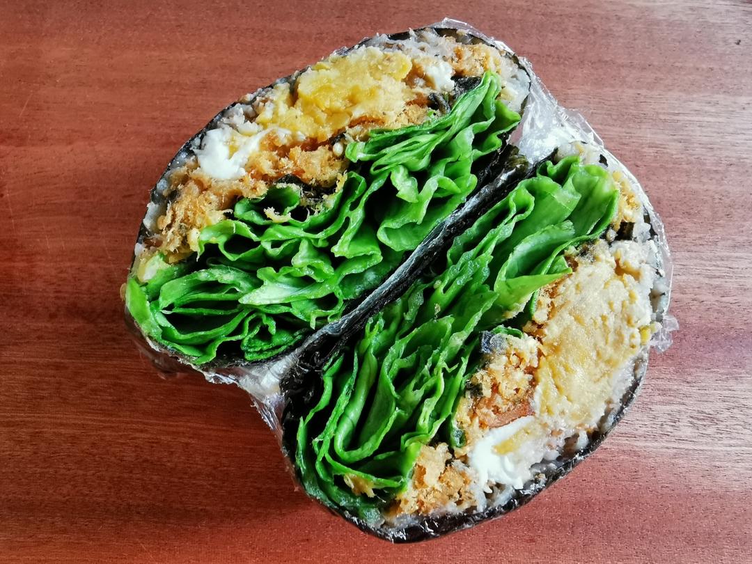 其实除了海苔和黑麦片是固定搭配,其他材料想吃啥放啥。 这次放的是咸蛋黄、肉松和生菜。我用的是无其它添加的黑麦片,在热水里泡几分钟就能吃了。在泡的时候,就可以准备其他材料,刚刚好。