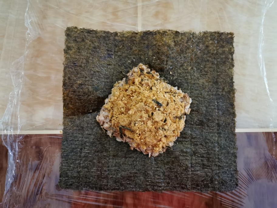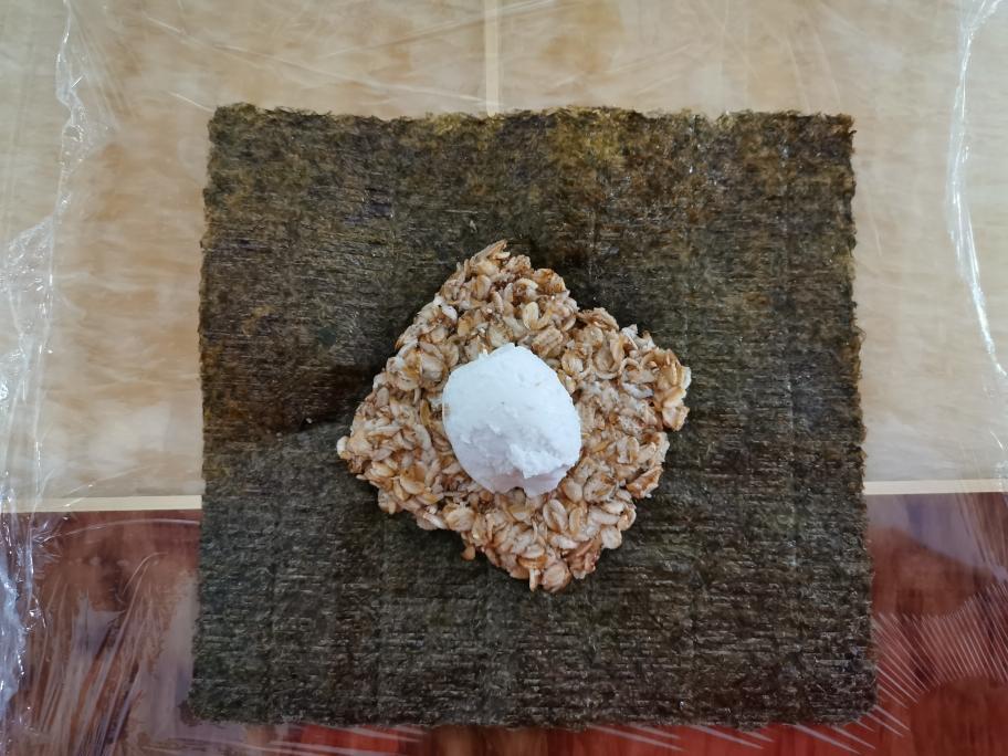 首先,保鲜膜铺在最下面,码上海苔和滤掉水的黑麦片,我准备的是生重20g,大家如果觉得不够,还可以再加,看个人喜好。