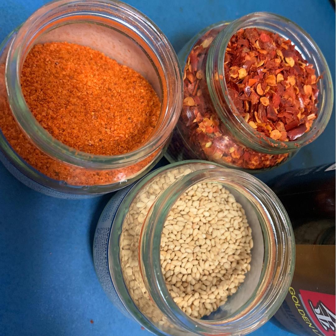 酱油2勺,醋1勺,耗油1勺,香油5.6滴,把切好的葱末,蒜末放里,再放上半勺辣椒片,一勺辣椒末,一点芝麻