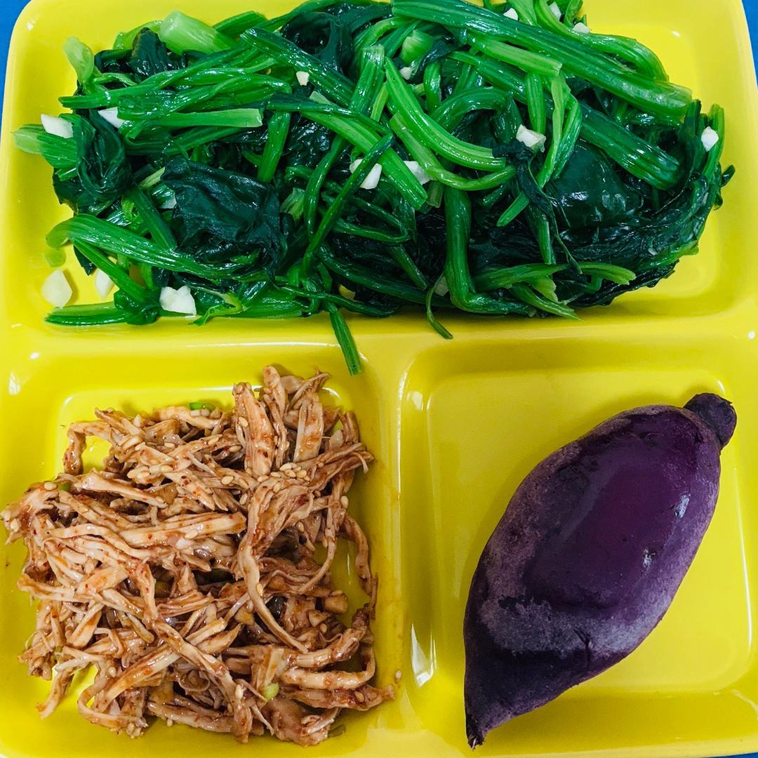 这个就是我的减肥大餐了,拌菠菜,手撕鸡胸肉,小紫薯。按照4:3:3的比例吃中饭和晚饭,主食尽量吃粗粮,肉尽量吃鸡,鱼,虾,牛肉。