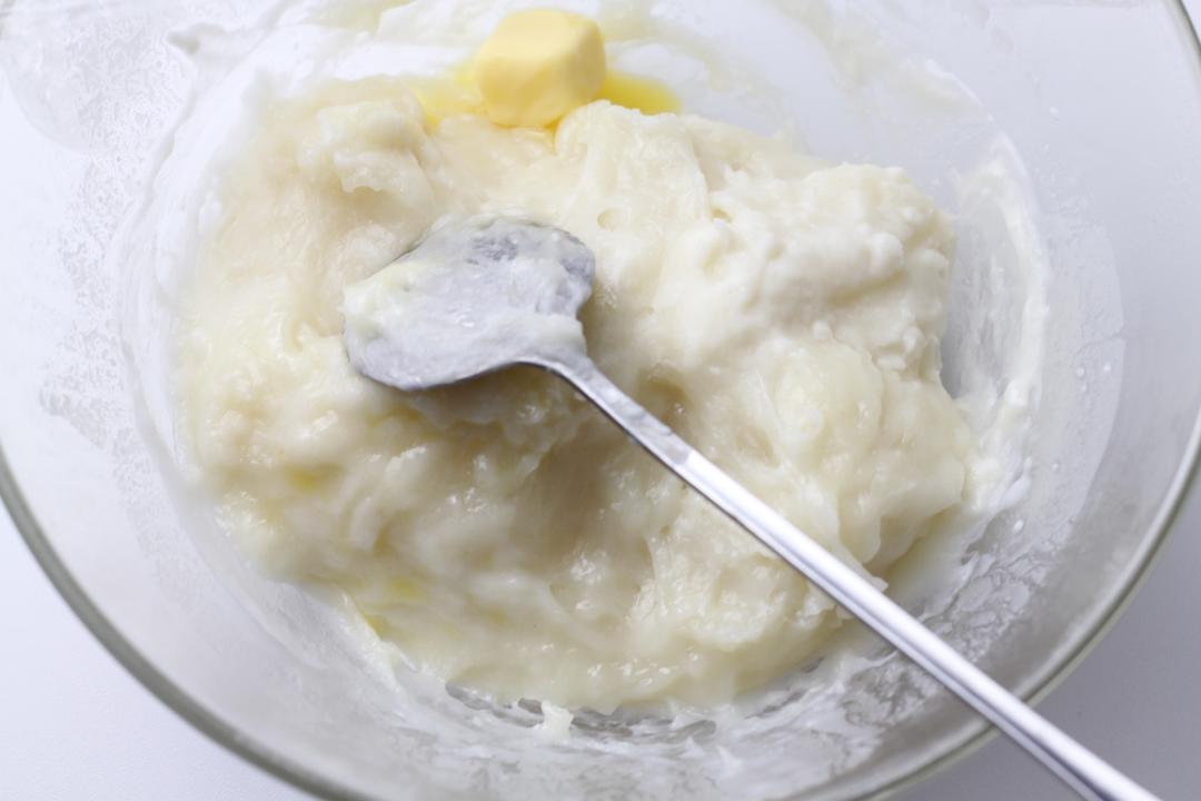 面团发酵时来处理麻薯,将除黄油外的麻薯材料放入碗中,微波炉先加热2min,取出,翻拌面浆。继续加热约1min,趁热加入黄油,揉匀。