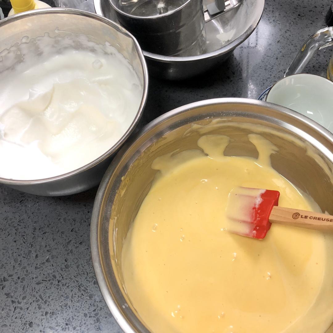 好嘞,打发好的蛋白霜(湿性)和蛋黄糊混合搅匀~
