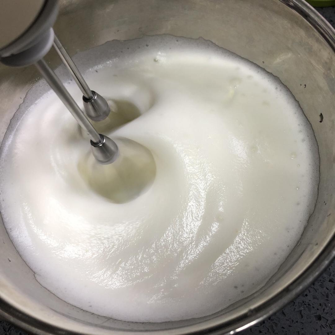 蛋清从冰箱取出来,开始高速打发蛋清,滴5滴柠檬汁,打到大泡泡加第一次糖。