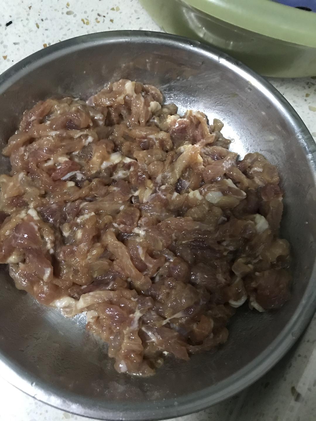 第一步:先把猪肉切丝,用盐 蚝油 鸡精 花生油 2勺水 抓几下,然后再放2勺生粉再抓均匀腌制。