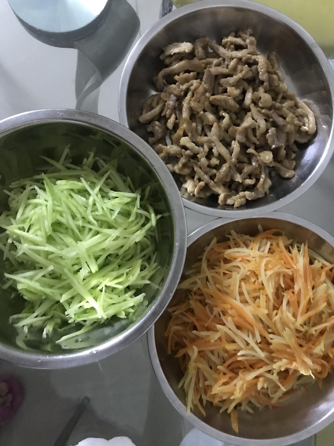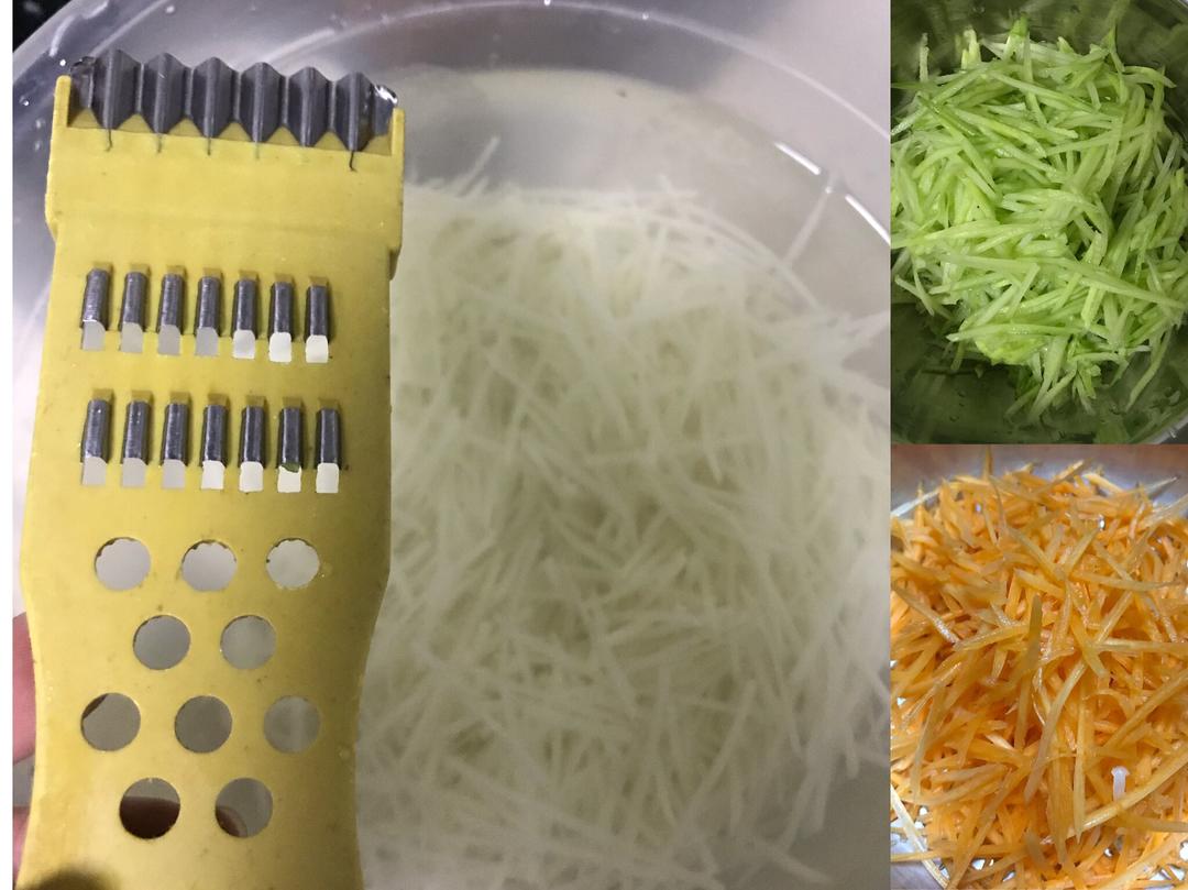 第二步:用刨把土豆 红萝卜青瓜刨成丝,土豆用水泡去淀粉。青瓜可以换成 葱、香菜。