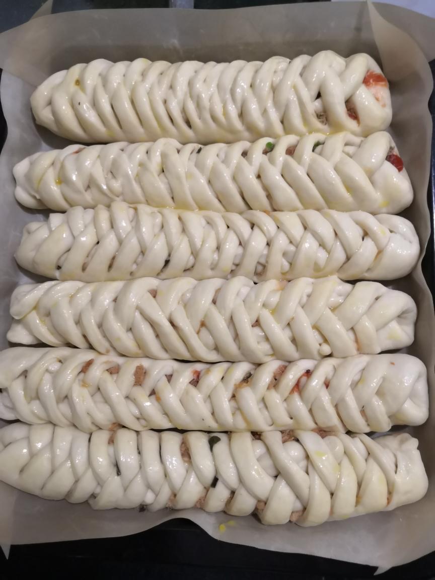 成型:面粉发好后取出排气,分成6个面团,做成6个辫子面包。 二发:做好的面包放进烤箱,放一碗开水在烤盘底,等待发酵。 烘烤:面包发酵两倍大后,取出,开烤箱180度,预热十分钟,烤箱预热时间,给面包胚表面刷蛋液,烤20分钟出炉,其间注意,面包上色了要加盖锡纸。