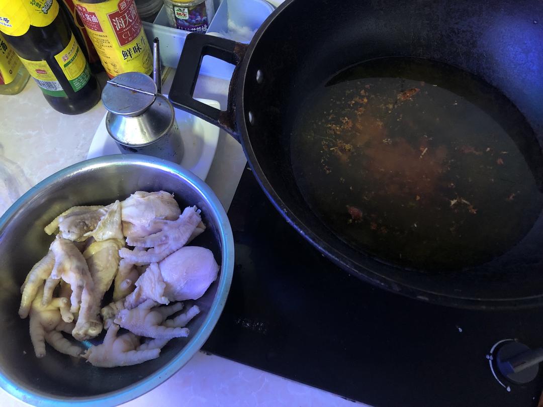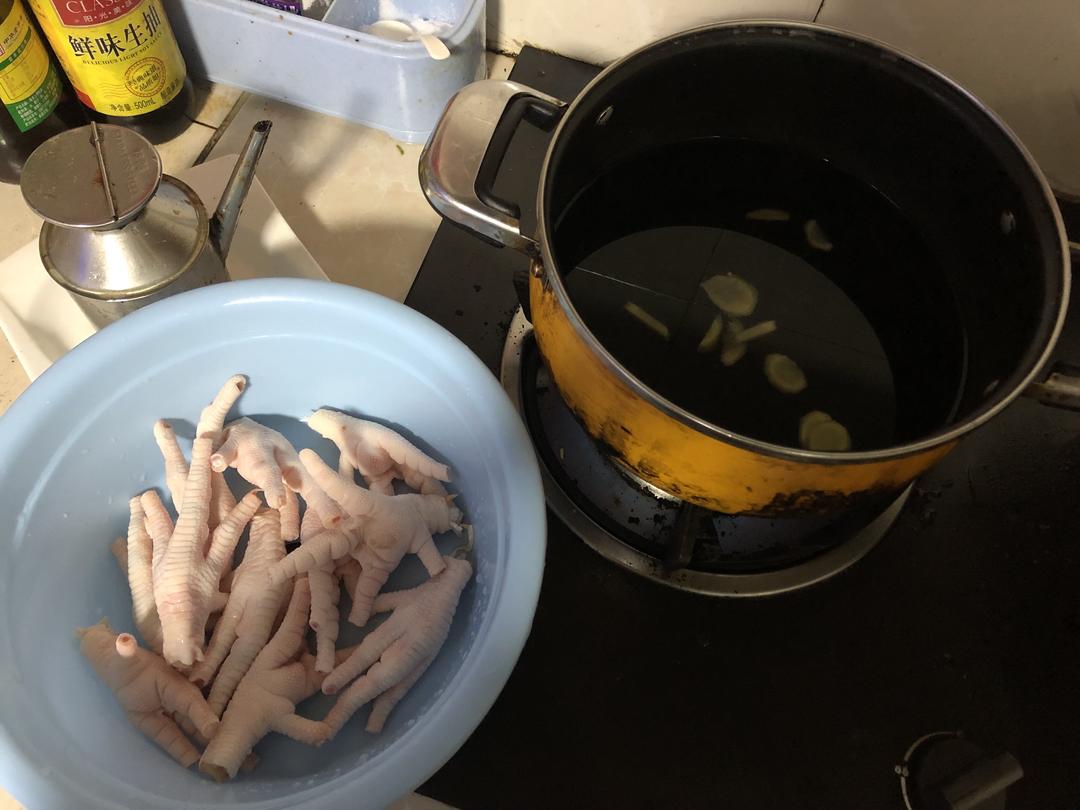 煮3–4分钟。捞起冲冷水,洗干净鸡爪的油脂。
