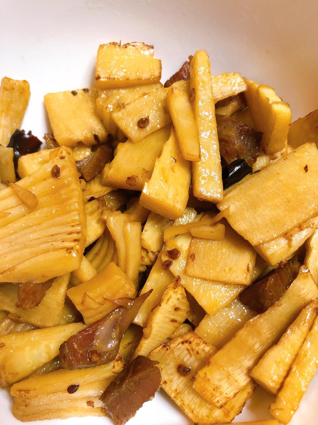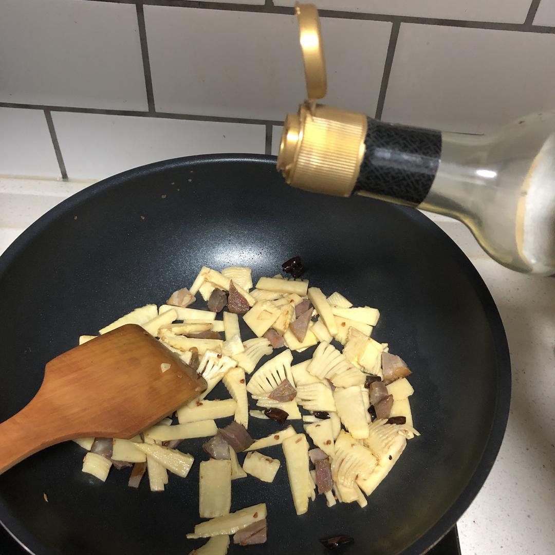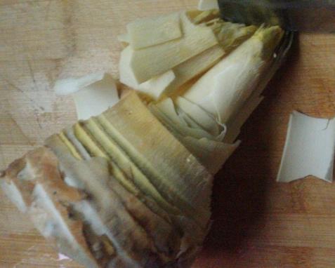 倒入煮熟的笋片。下锅前可以再切薄,不然我怕它真的用生命教我什么是顽强不屈!