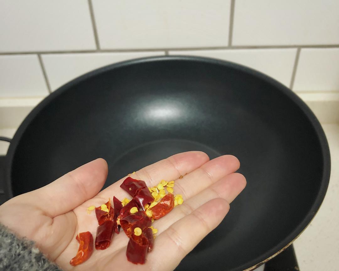 倒油烧热后,加入一小把切碎的干辣椒,中火炒到变黑。这样,炒什么都变微辣(对湖蓝人来说)。