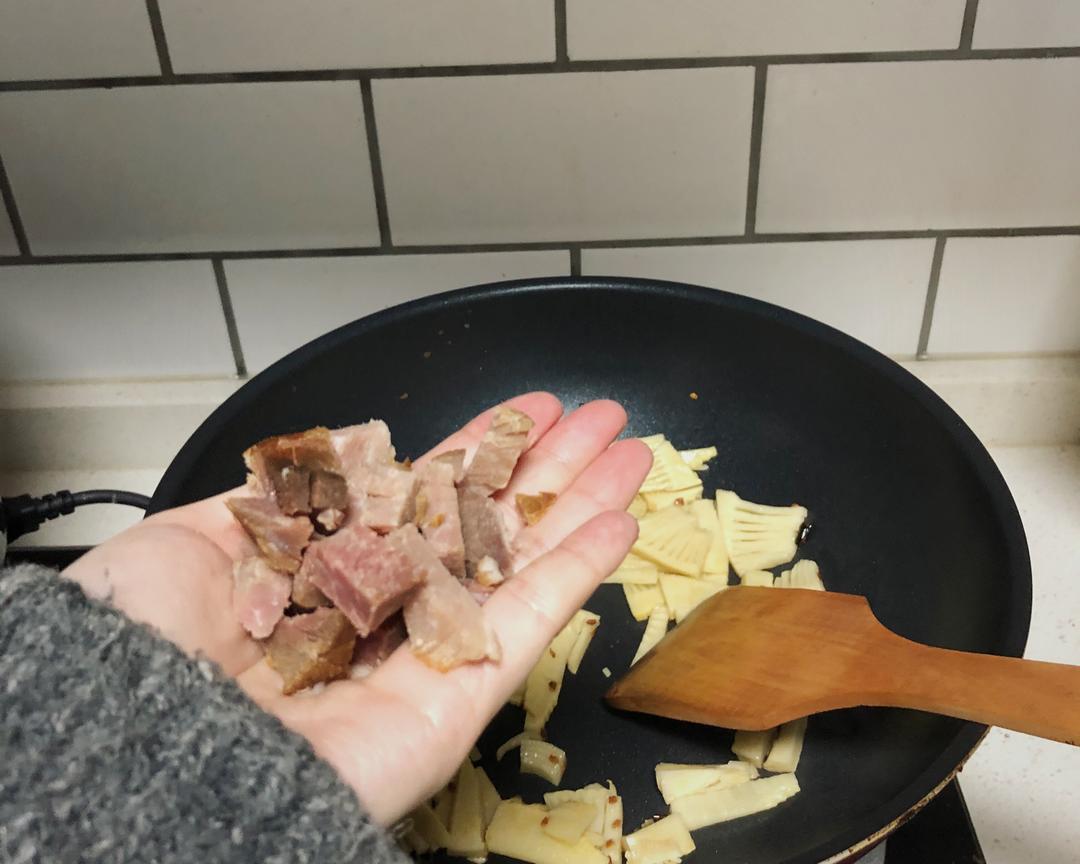 再加一小把碎腊肉。带点肥肉的那种更香。一起翻炒翻炒。