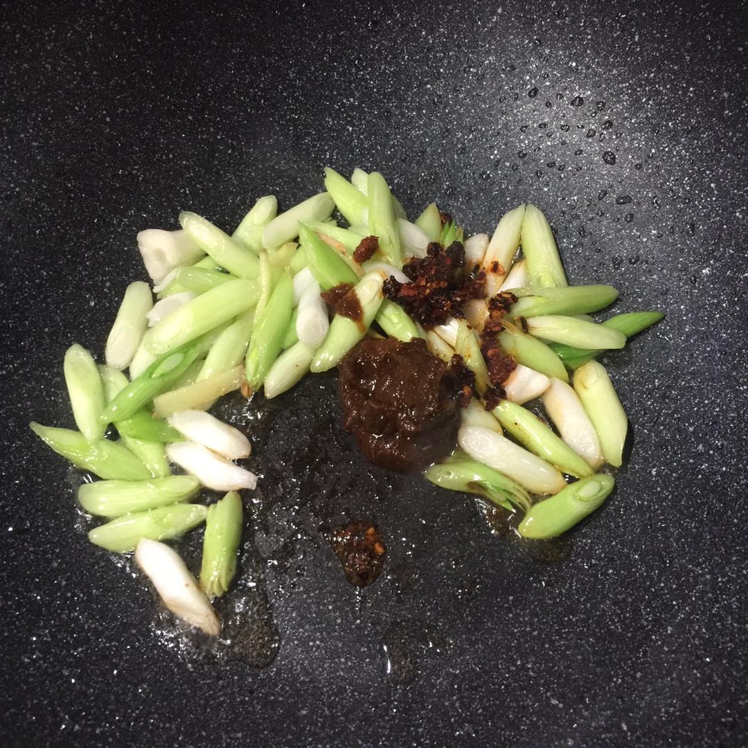 这时放入1小勺老干妈香辣脆油辣椒,1勺豆瓣酱,继续翻炒出香味。