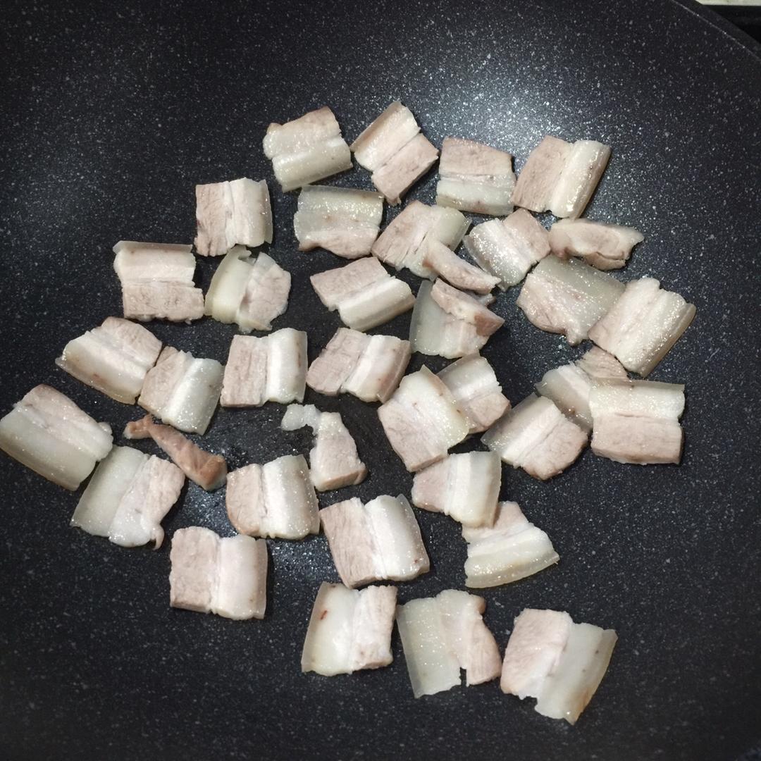 慢慢煸炒五花肉,将其油脂全部逼出,煸出的油足够下面的操作。