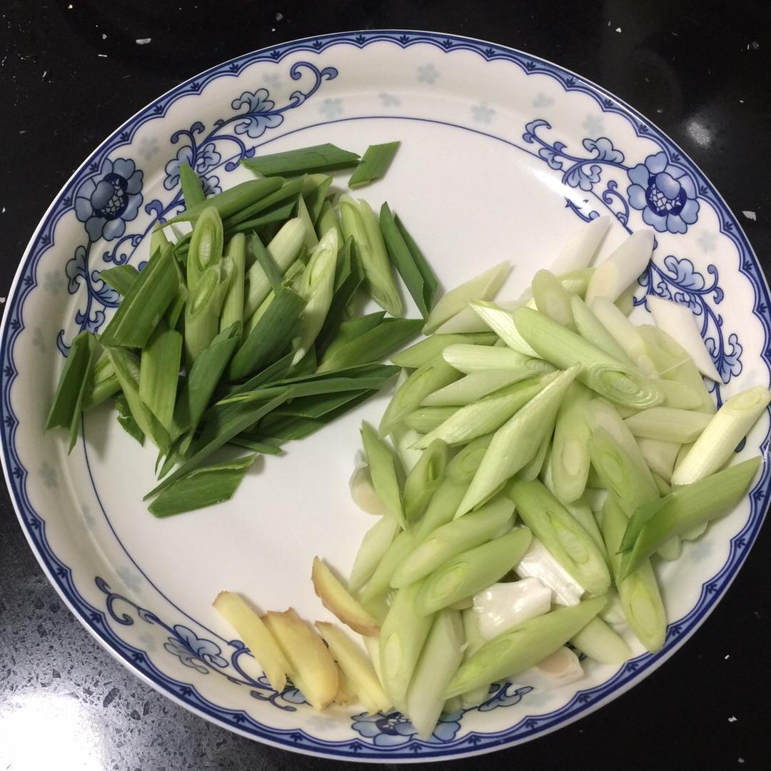 青蒜洗净切斜刀,姜片切丝,备用。