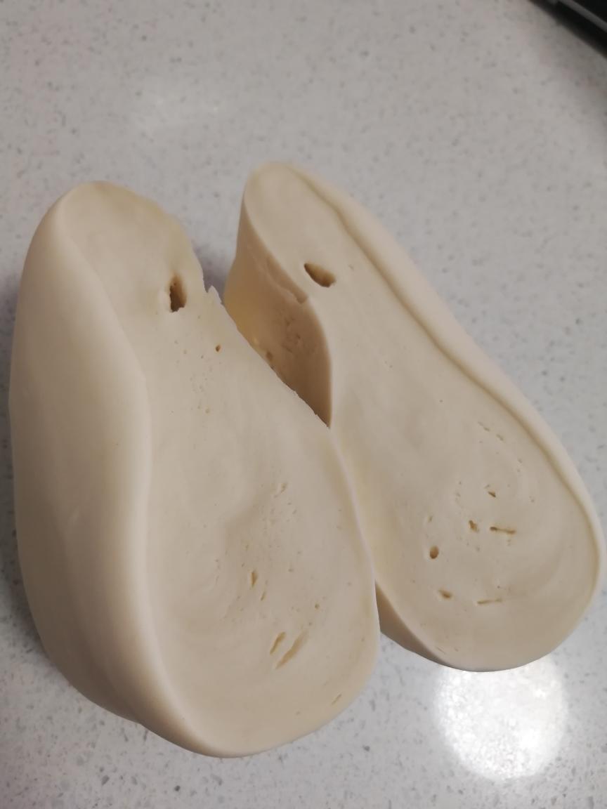 切开面团,里面有小孔,说明面还没揉到位,继续揉面。