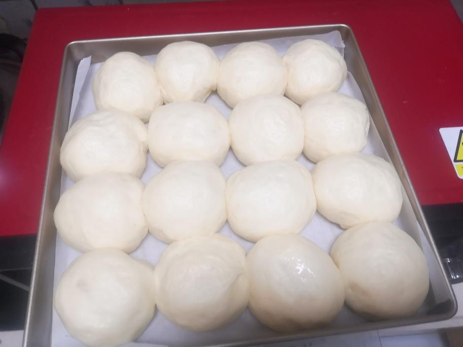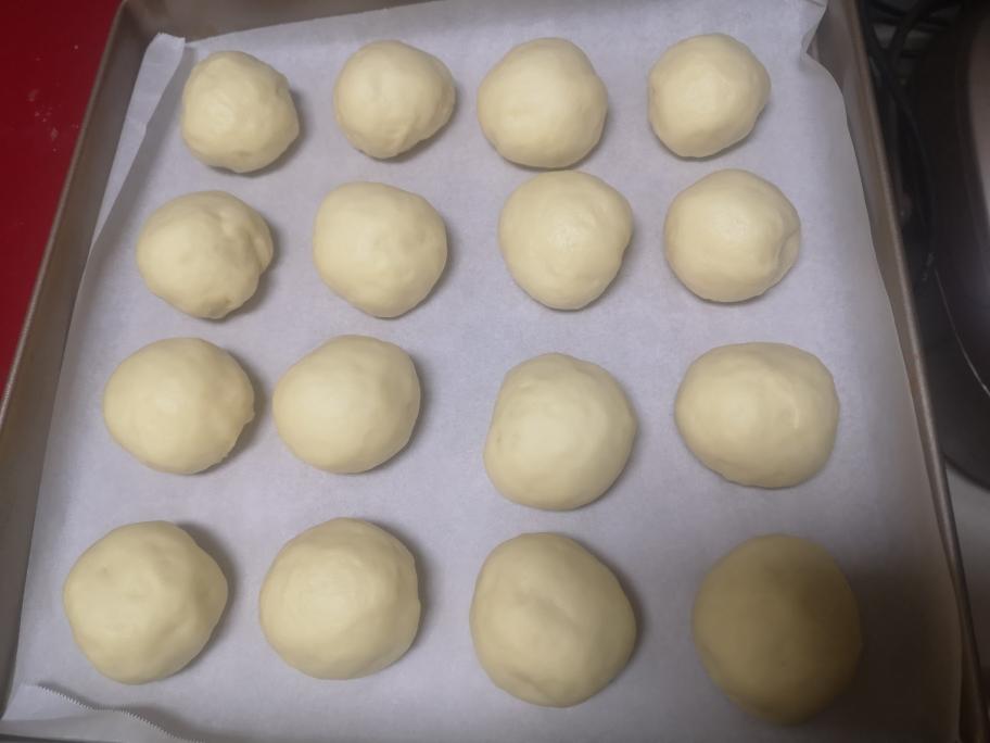 主面团排气后,分成16份放烤箱二次醒发,大概要1个小时左右,烤箱内放一碗38度左右温水,这样有利于面团不那么干而且还可以加快面醒发