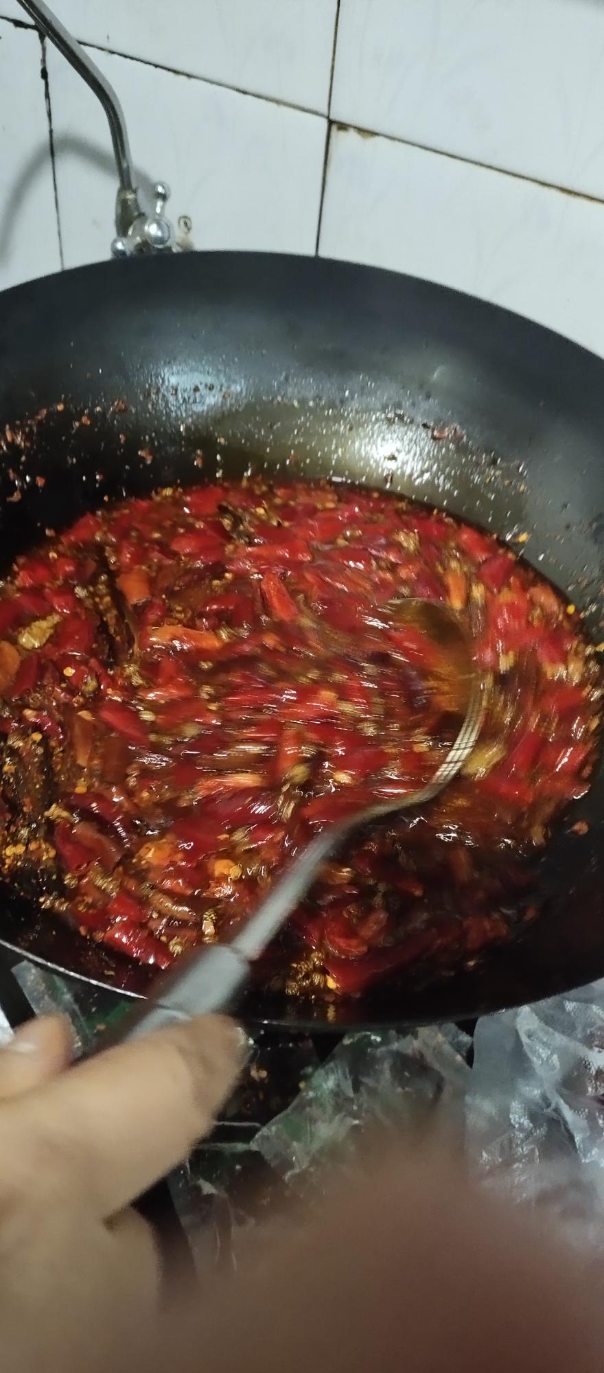 炒到辣椒皮肤发黄,倒入篓筛中,把红油和香料分开。