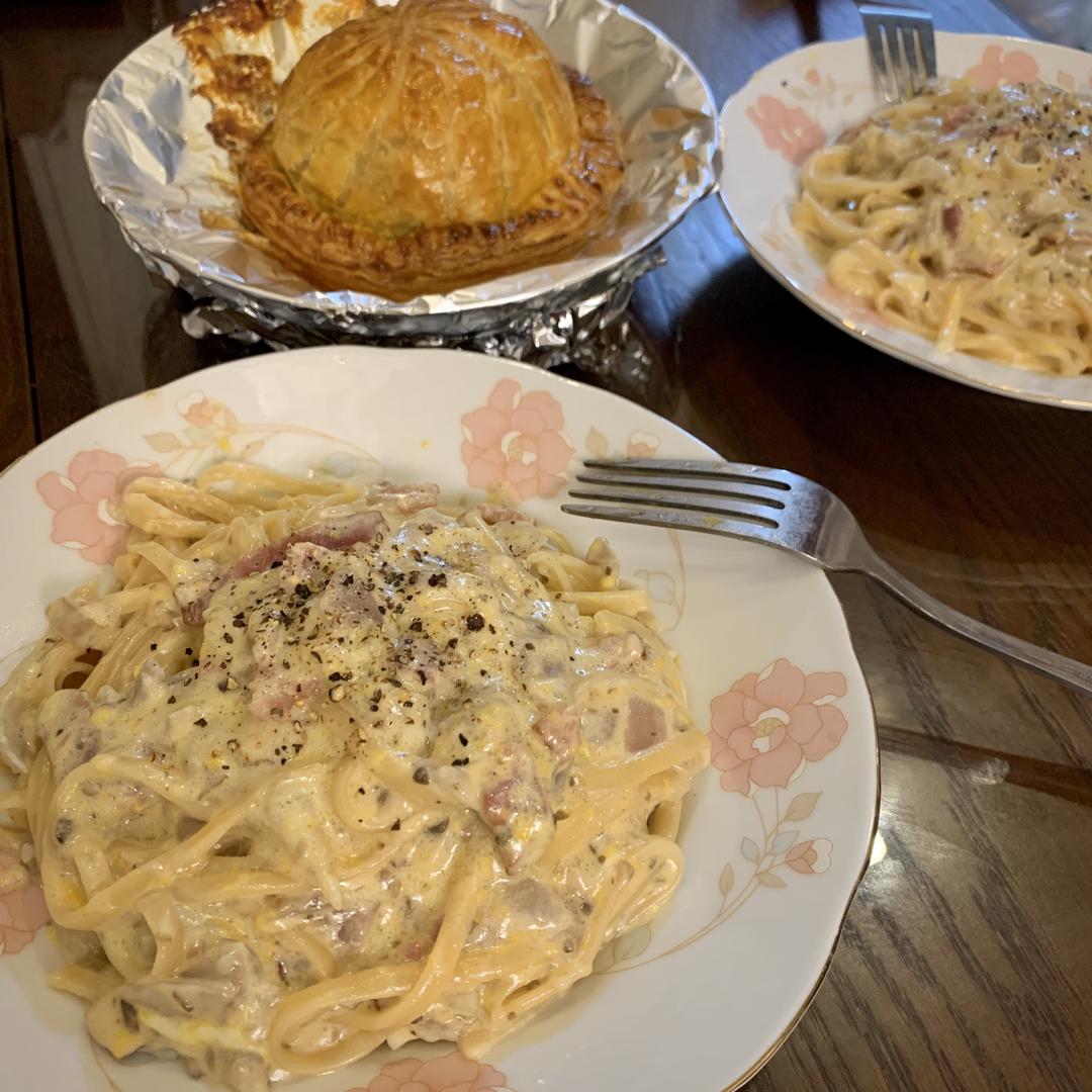 把面与培根蘑菇翻拌均匀,待稍微降温一点后,倒入芝士与蛋液混合物并迅速搅拌,让面条与酱充分混合。温度不宜太高,以免鸡蛋结块,但温度太低也会使面酱不能变稠。这个加入的时机需要掌握好,保险的方法就是关火后大约一分钟(我自己的经验)边倒边搅,只要速度够快鸡蛋就反应不过来(•̀ω•́)✧。