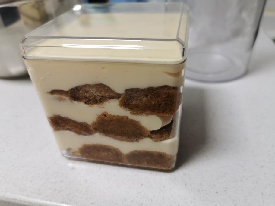 手指饼干切成适合容器的大小,沾上咖啡酒混合液,沾一下就拿起来,千万不要泡,一泡就烂掉了。