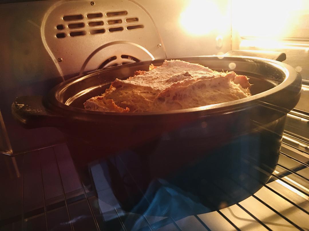 面团取出来时放入铸铁锅,我用的是可以进烤箱的土锅。我家烤箱210度进行预热约15-20分钟