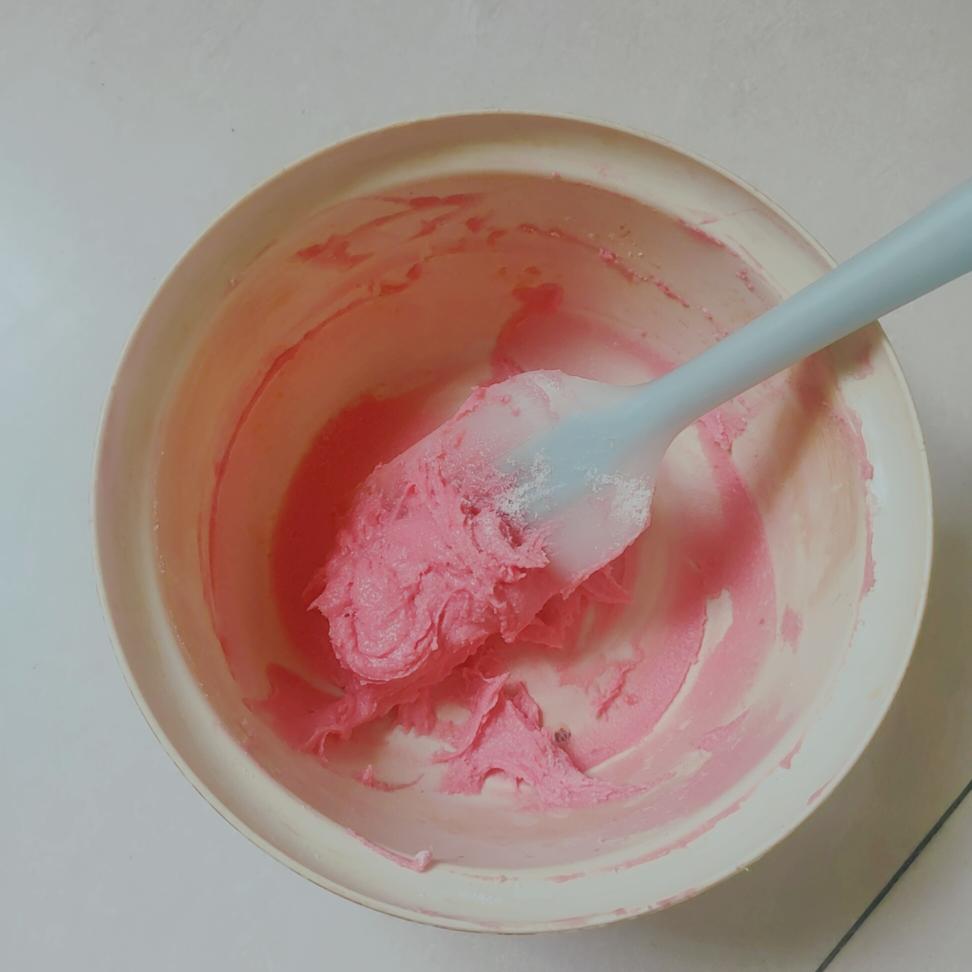 奶酥 黄油和糖浆糖粉混合均匀 颜色不一样很容易看出来是否混合均匀 我希望奶酥比较粉 所以加了些色素 不介意的话就不用加
