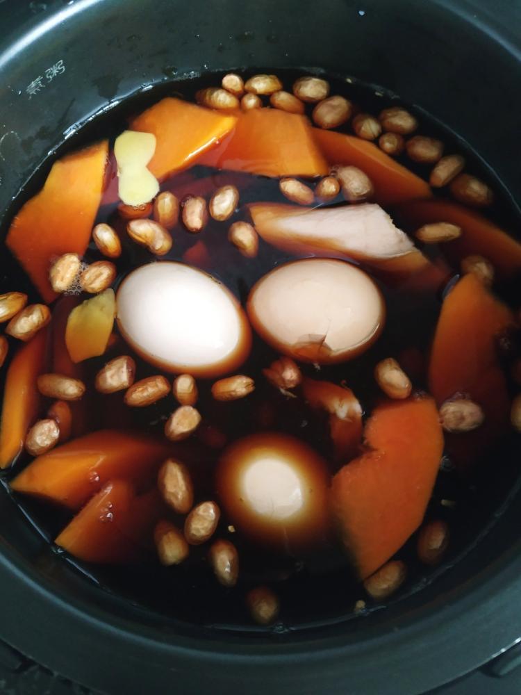 材料准备好,花生,鸡蛋,木瓜,姜片,红糖,一碗甜醋。