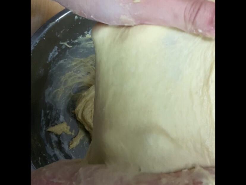 这个面团比较湿,粘手预警!记得戴手套,或者用硅胶铲辅助揉面。揉成比较粗糙易破的初级手套膜即可。