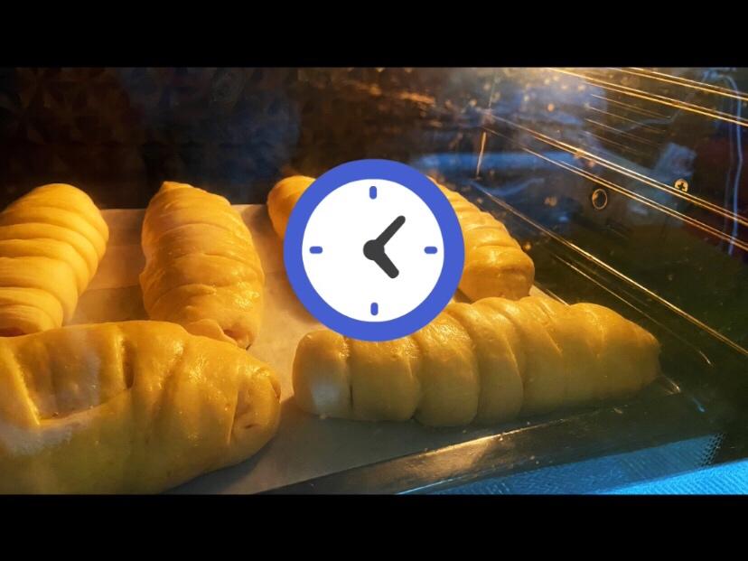 整形好的面包二次发酵,室温发酵30分钟。左上角小胖子是短边和长边调换方向卷的失败品,害,丑胖丑胖。