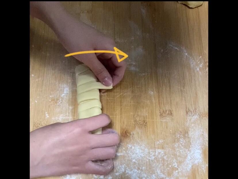 将每小条拉长,尾端包到面包底部,并将底部捏紧。