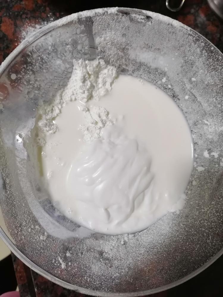 120糯米粉100牛奶100椰浆50糖粉30克玉米淀粉,搅拌至无颗粒到,用蛋抽能快一些。一定搅拌均匀了。