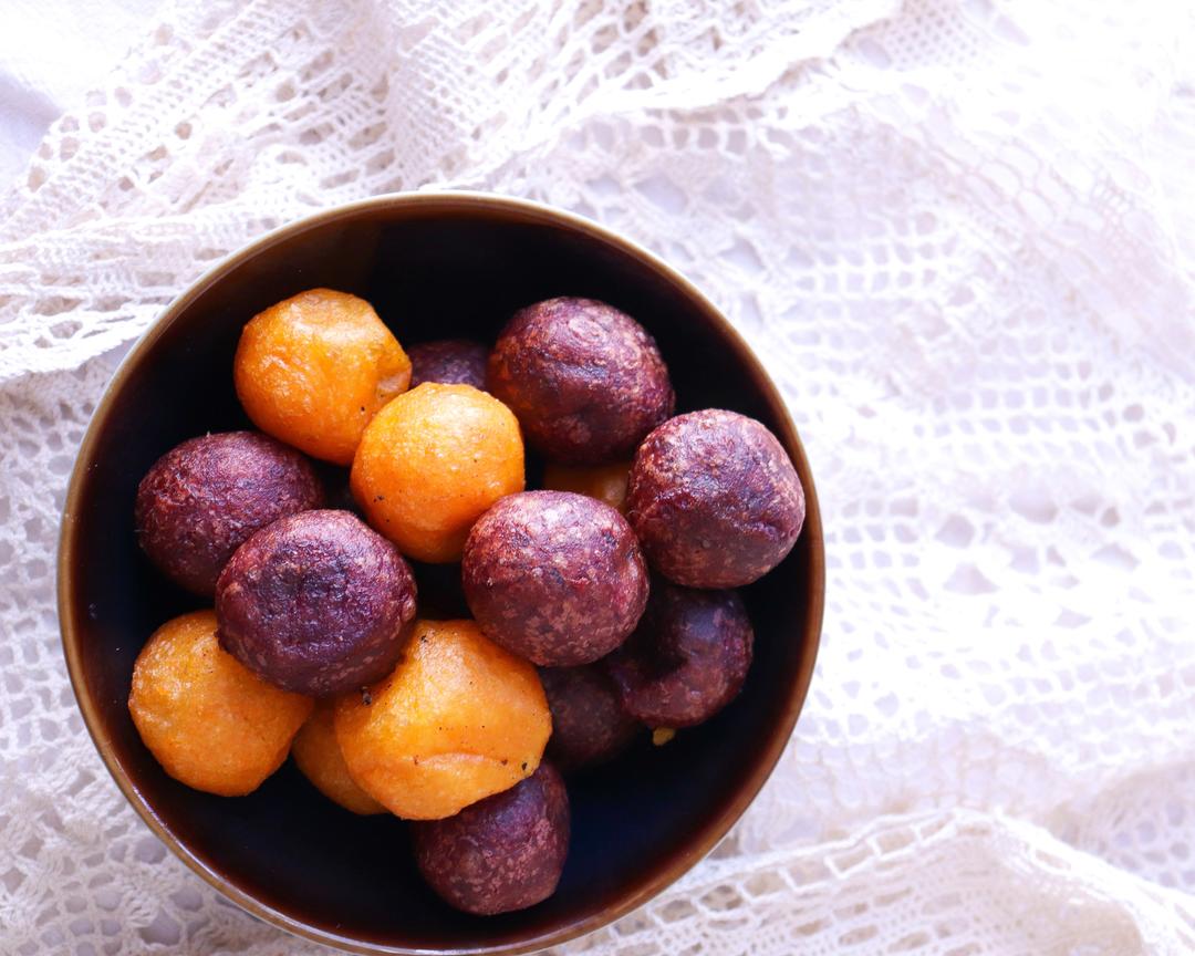 表面成型后,用勺子轻轻压扁地瓜球,这样可以让空气进去,放开后又会马上鼓起来。 多压几遍会更好吃。