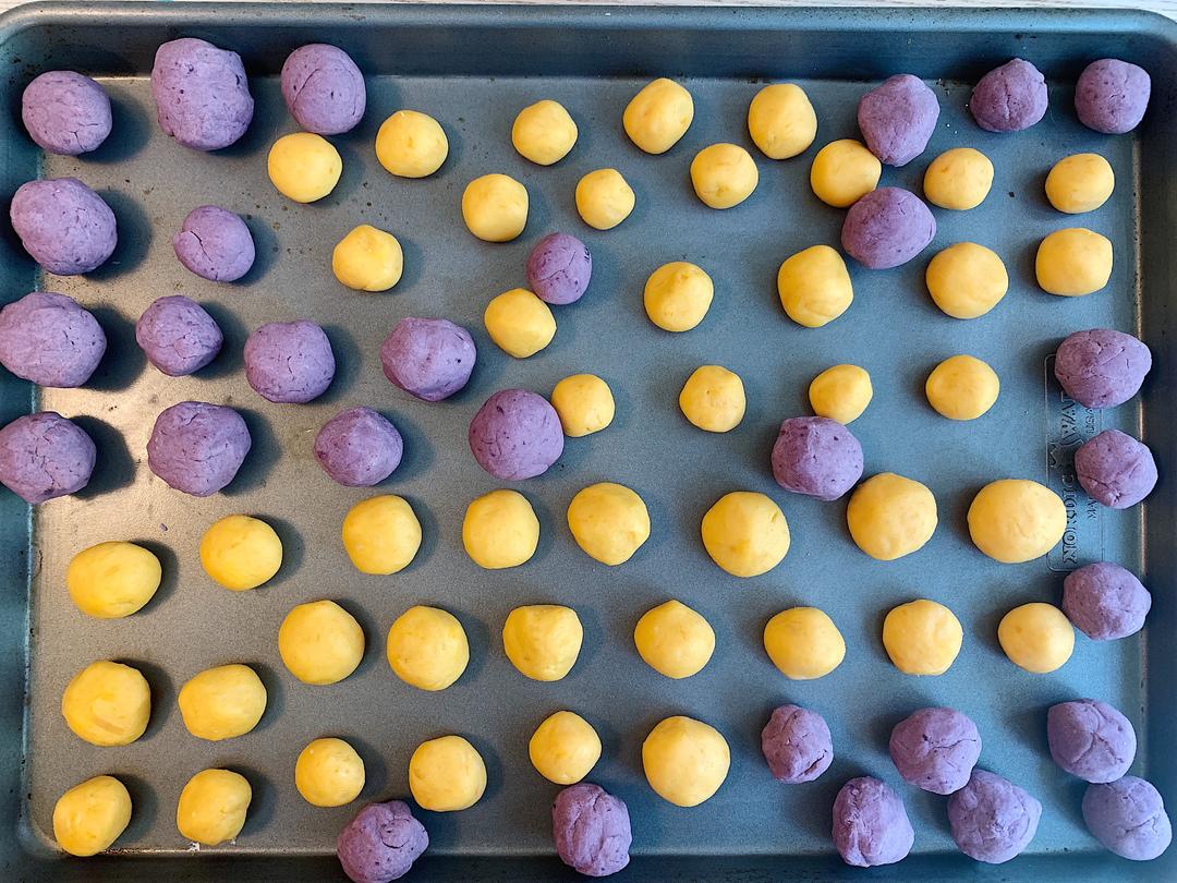 搓成长条,切成比芋圆大一些的大小,油炸后会变大2-3倍 面团太干的话也尽量不要加水,干一些的面团会更好。能搓成小球就好,实在不行加一点开水。太湿了可以加木薯粉。