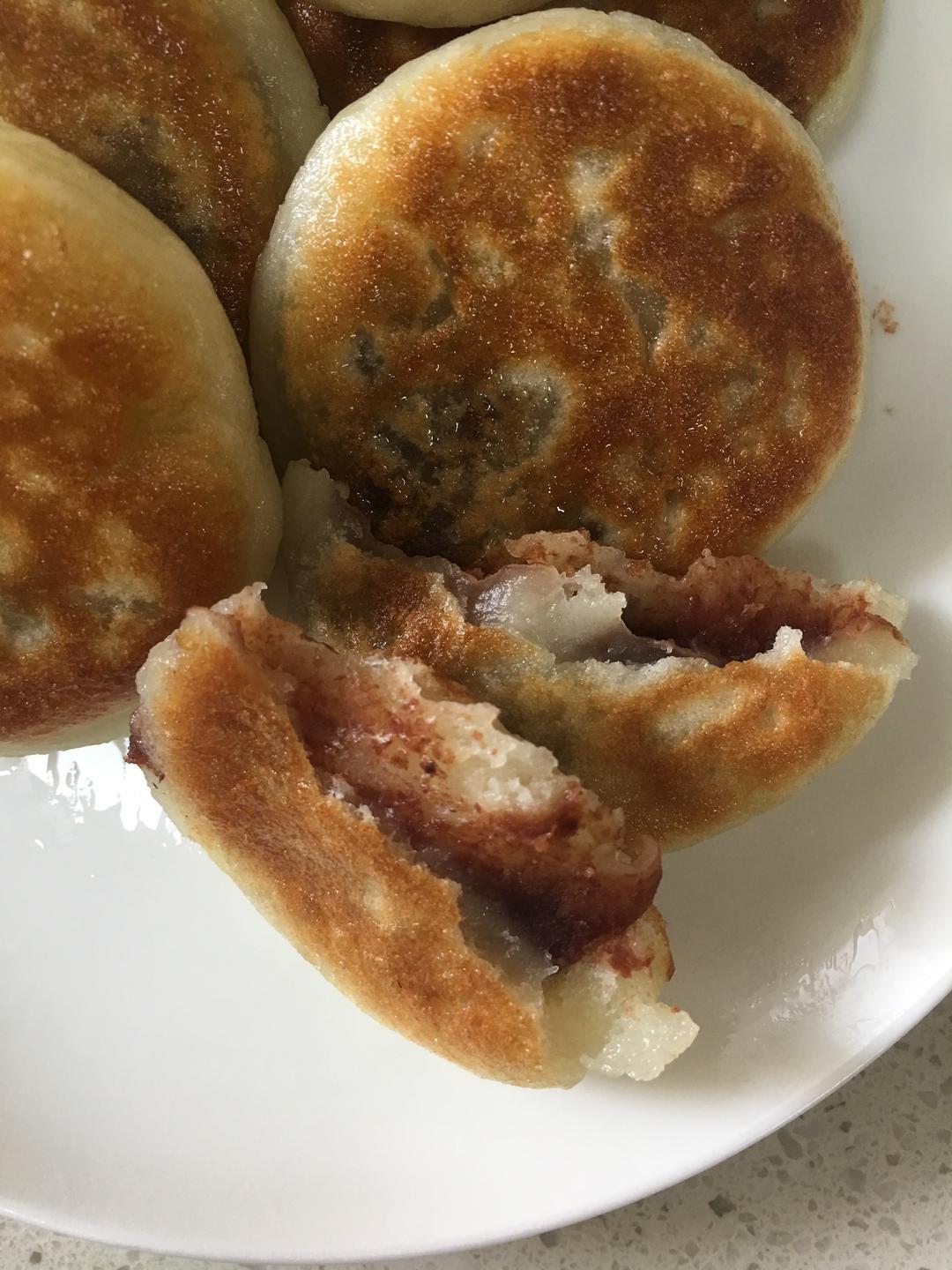 取出面团,稍微揉一下,揉成长条,分成12-14个小面团,拿在手里捏成小饼状,然后小心的包上豆沙馅儿(超市买的现成的),千万不要漏馅儿。一个个包好,放在案板上,等全部包好后,坐上平底锅,放少量油(煎的,不用太多油),再按包馅的先后顺序,把包好的团子稍稍摁扁(动作要轻柔),放入锅中,放的时候,要留空隙,饼子在煎的时候会发大一些,中小火,煎至两面金黄,用铲子摁压饼子不塌陷,立刻回弹即可。