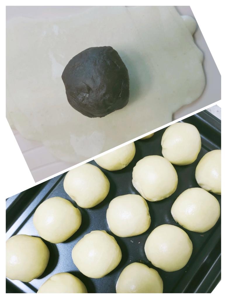 接下来,取一个第二次卷好的面团,滚圆,擀成圆形,包住一颗豆沙蛋黄,收好口朝下即可❤