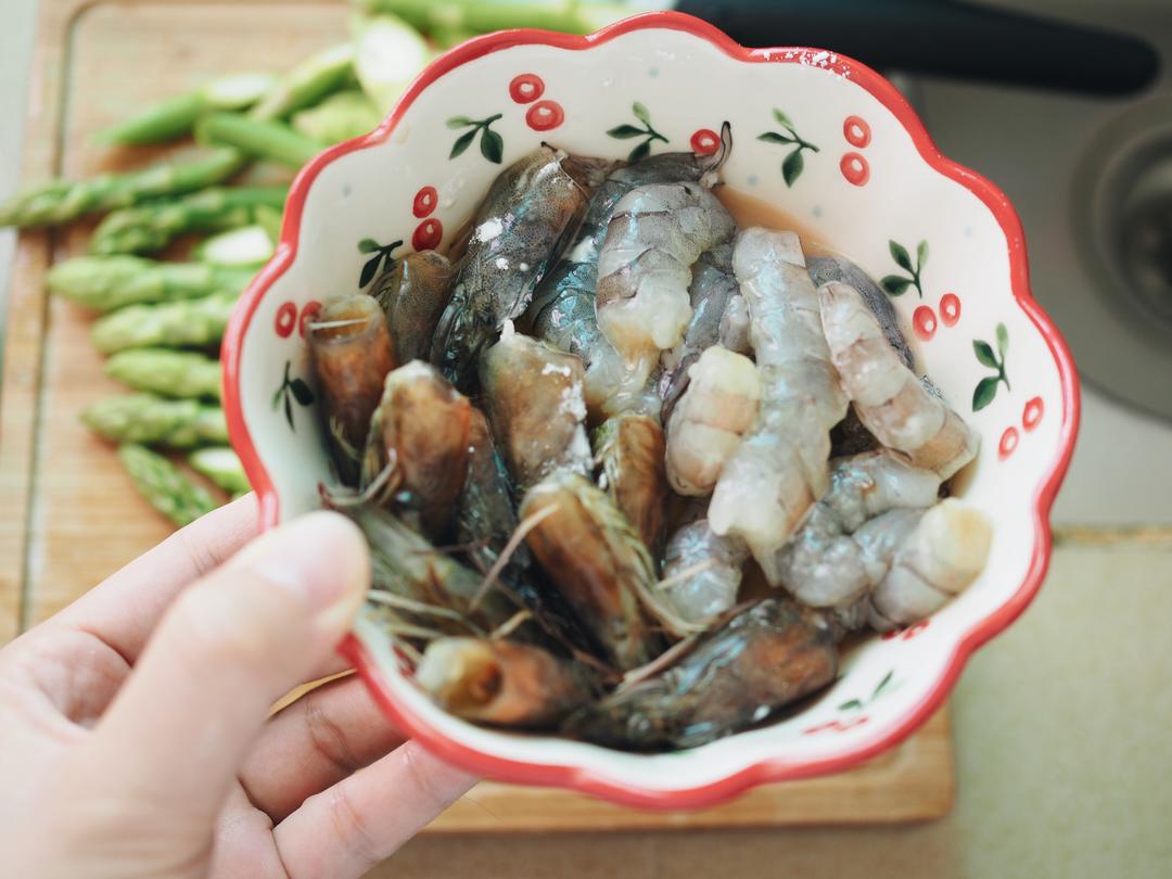虾头和虾身分开,虾仁剥壳。加一勺料酒去腥,虾仁裹一点点淀粉。