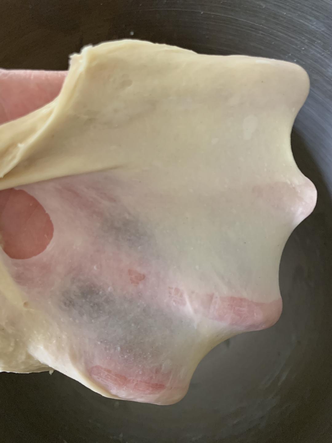 放入黄油后,继续低速挡搅拌,黄油完全融进去以后,换成高速,揉至图片状态即可。