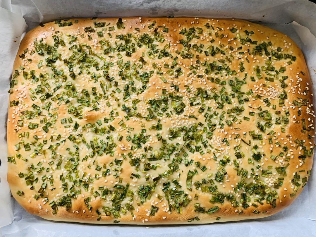 在发酵好的面饼上刷上一层薄薄的蛋液,撒上芝麻,最后撒上一层葱花。(葱花切好后拌一点油,然后加一点点糖和盐)预热烤箱180度,放进烤箱烘烤25分钟左右。(每个烤箱不同,给力的有些只需要18分钟,主要根据面饼的表皮颜色来决定时间长短)