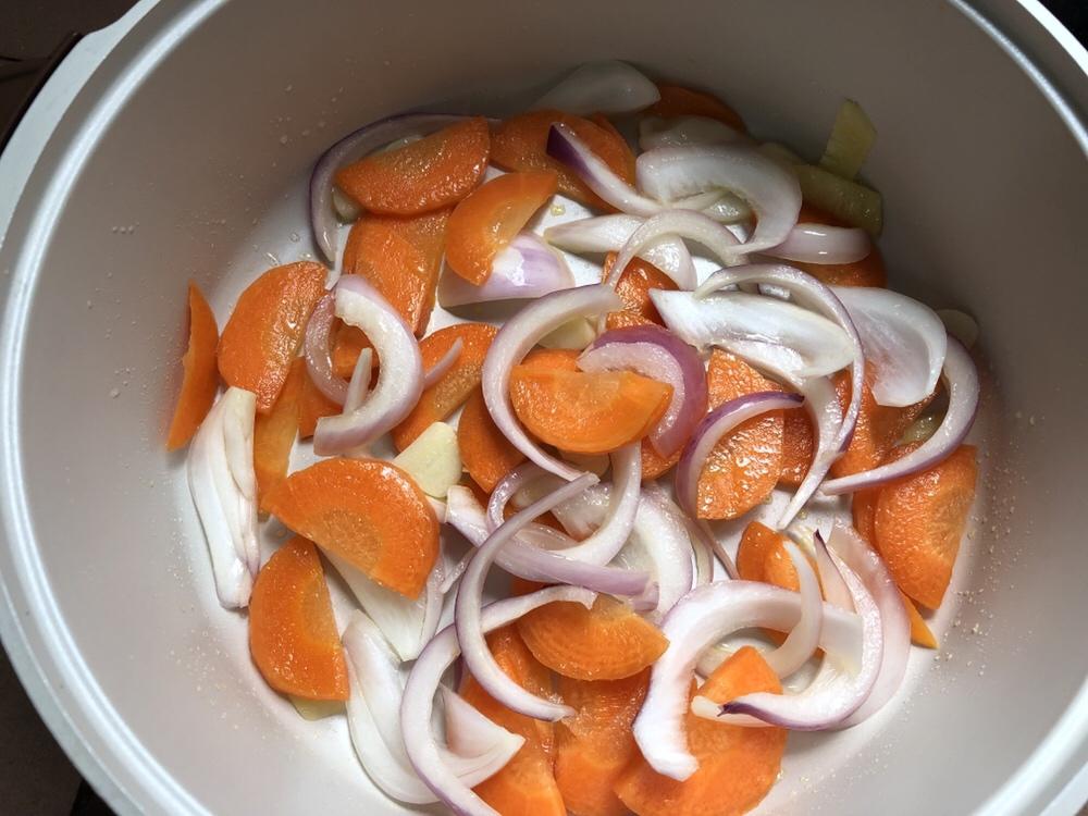 热锅下油,先加入大蒜,姜,洋葱翻炒一下,然后倒入胡萝卜炒出香味。