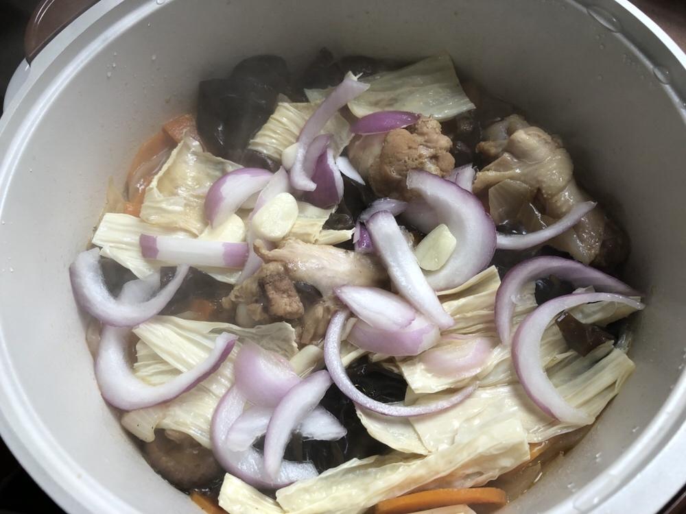 12分钟后加入腐竹(腐竹不能太早放,容易煮烂),我想吃有点脆脆的洋葱和大蒜,所以刚刚留了一点现在加,同样是大火煮2-3分钟就可以出锅啦。