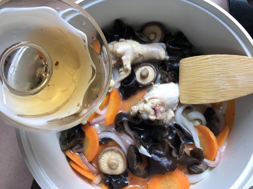 加入差不多可以没过一半食材的开水和泡香菇的水(精华)。