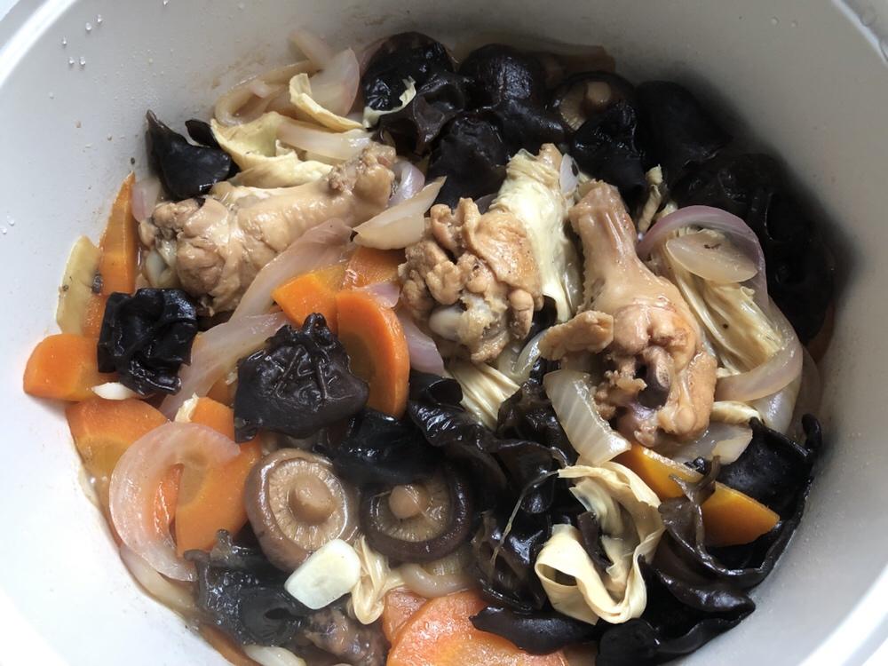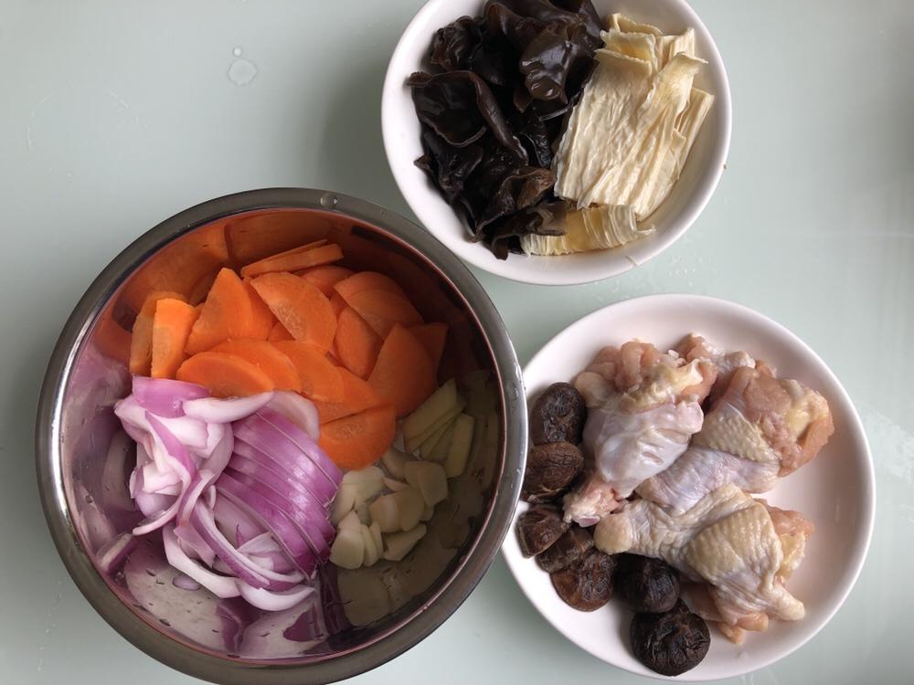 1. 胡萝卜切片,洋葱切丝。2. 腐竹切段。3. 香菇要挤干水分,划十字刀。4. 木耳切小块。5. 鸡腿划几刀,好入味。6. 姜切丝,大蒜切片。