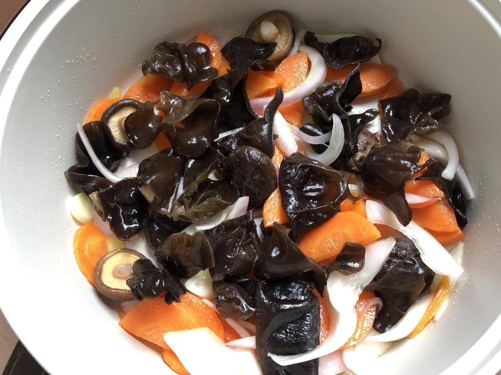 提前准备好食材:木耳提前3个小时用清水泡发,香菇提前1个小时泡发,腐竹用温水泡一下就软了,其他食材洗干净备用。