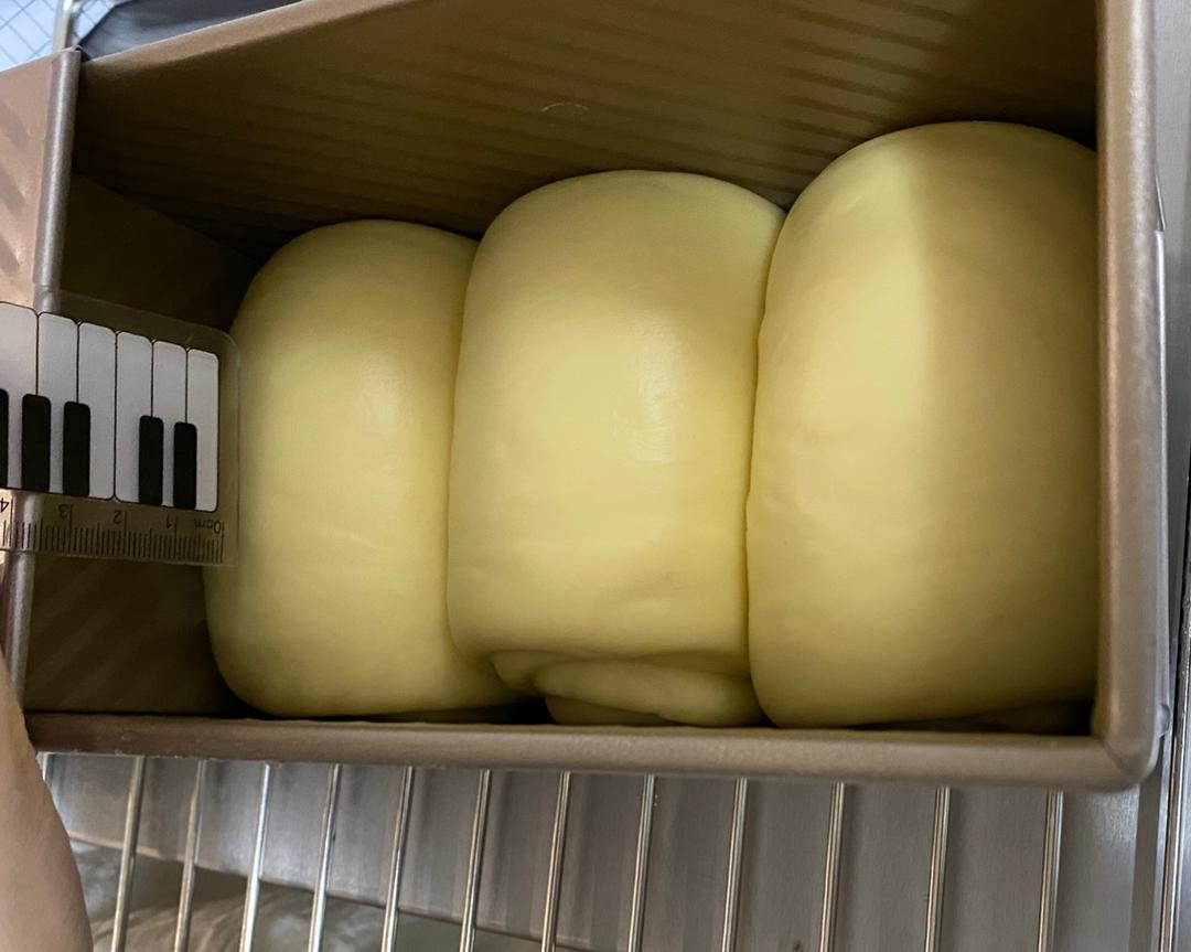 这是之前做的,为了圆角,发到了约七分满。面团不湿,表面光滑。含水量52%。