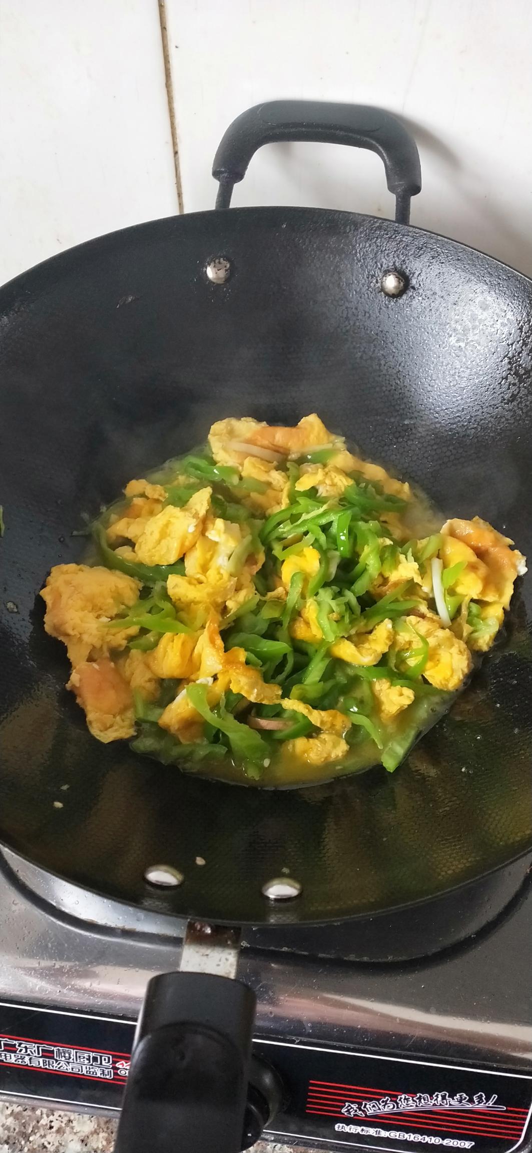今天用了5只青椒,5个鸡蛋(妈妈自己养的鸡生的土鸡蛋,所以颜色特别黄)