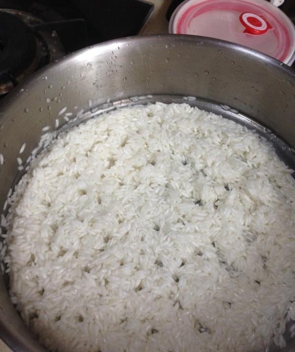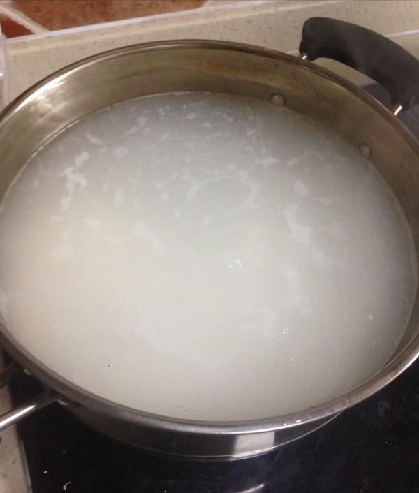 水烧开至沸腾,放糯米,用勺子搅动至水再次沸腾时捞起。(要多放点水,以免糯米粘在一起)