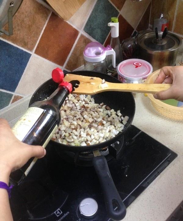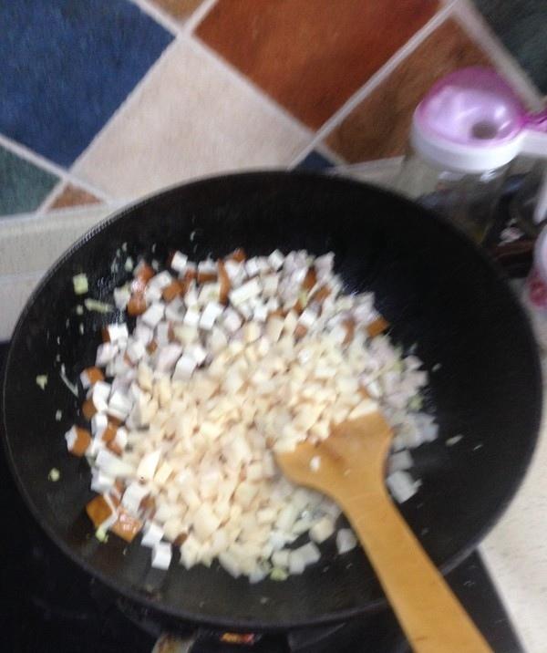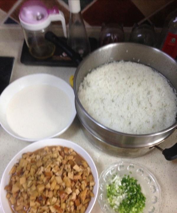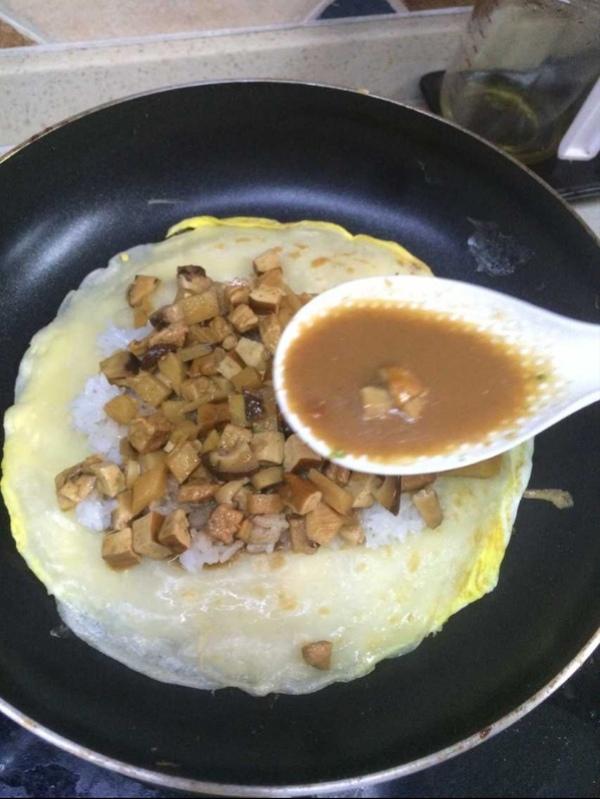 将馅料铺在糯米上,加一些酱汁,以便入味。